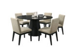 Jasper Ebony Black 7 Piece 59″W Round Dining Table Set with Pedestal Base and Beige Fabric Chairs – Lilola