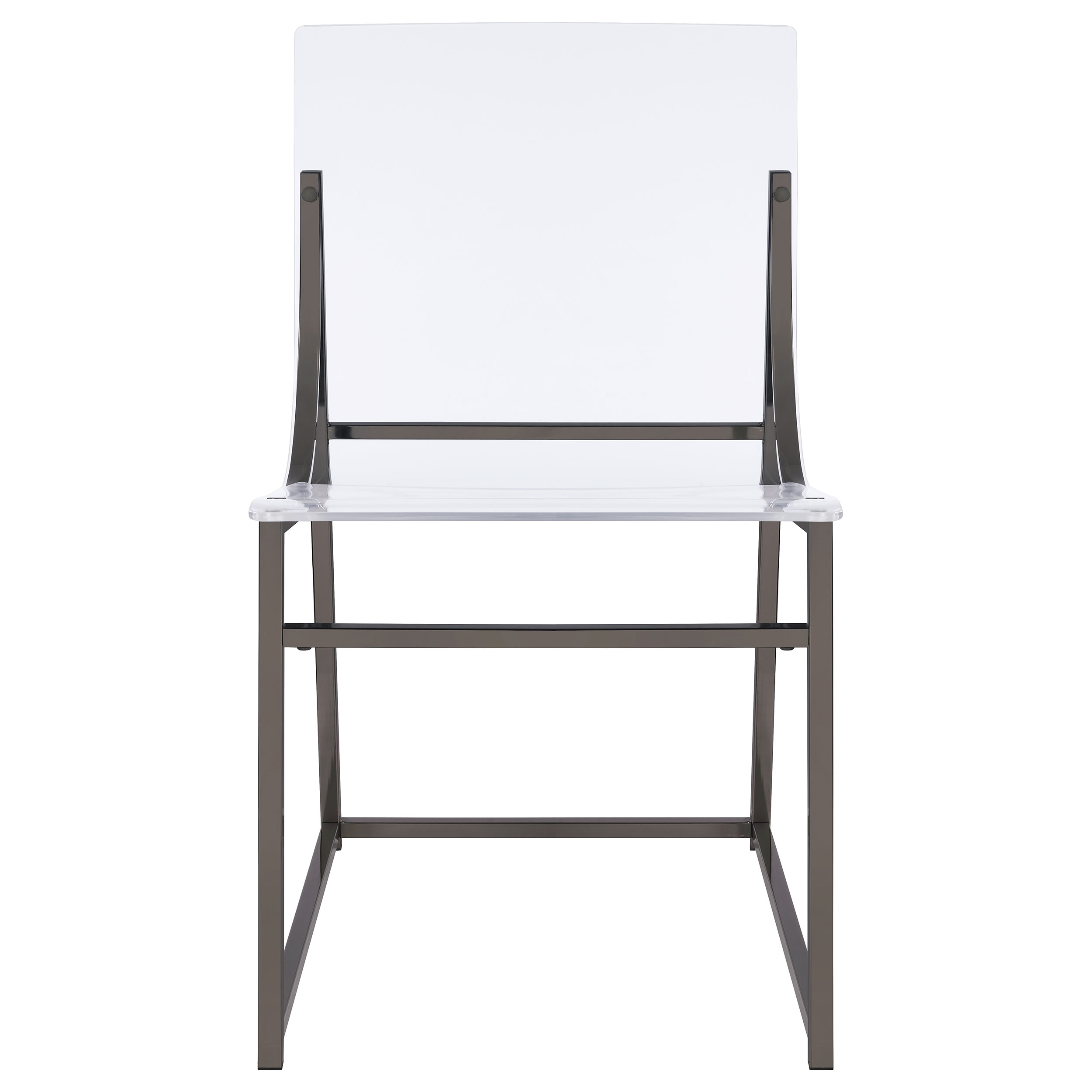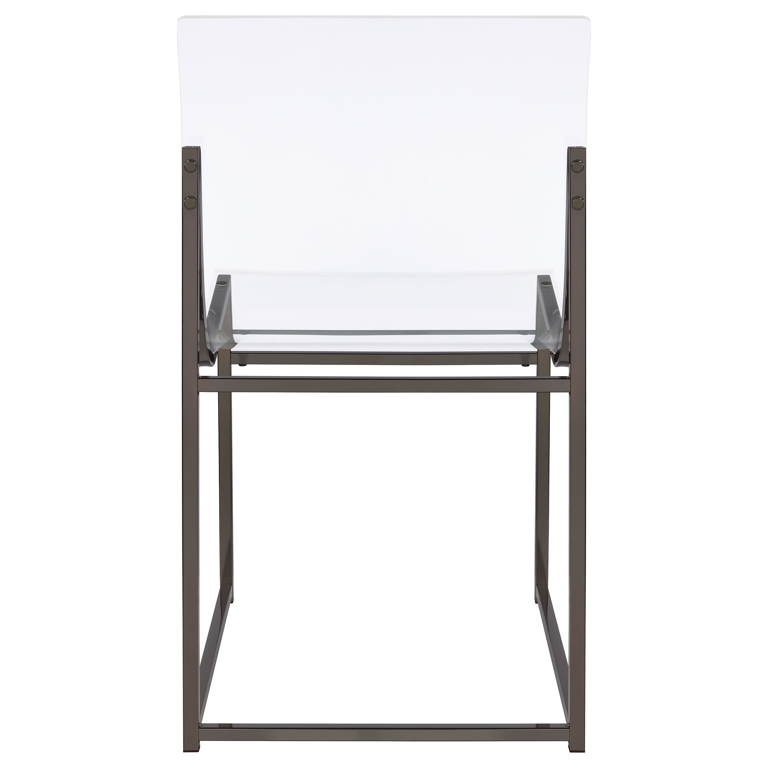 Elevate your dining experience with this striking five-piece dining set, blending contemporary design with modern elegance. The centerpiece is a round dining table, featuring a sleek mirror glass tabletop and supported by angular, open frame legs that add a touch of geometric flair. Complementing the table are four avant-garde dining chairs that redefine modern style with their clear acrylic backs and minimalist metal frames. The black nickel finish of the table and chairs enhances the set’s sophisticated appeal, making it perfect for both casual meals and elegant entertaining. Whether hosting dinner parties or enjoying a quiet meal, this dining set transforms your space into a chic dining oasis.