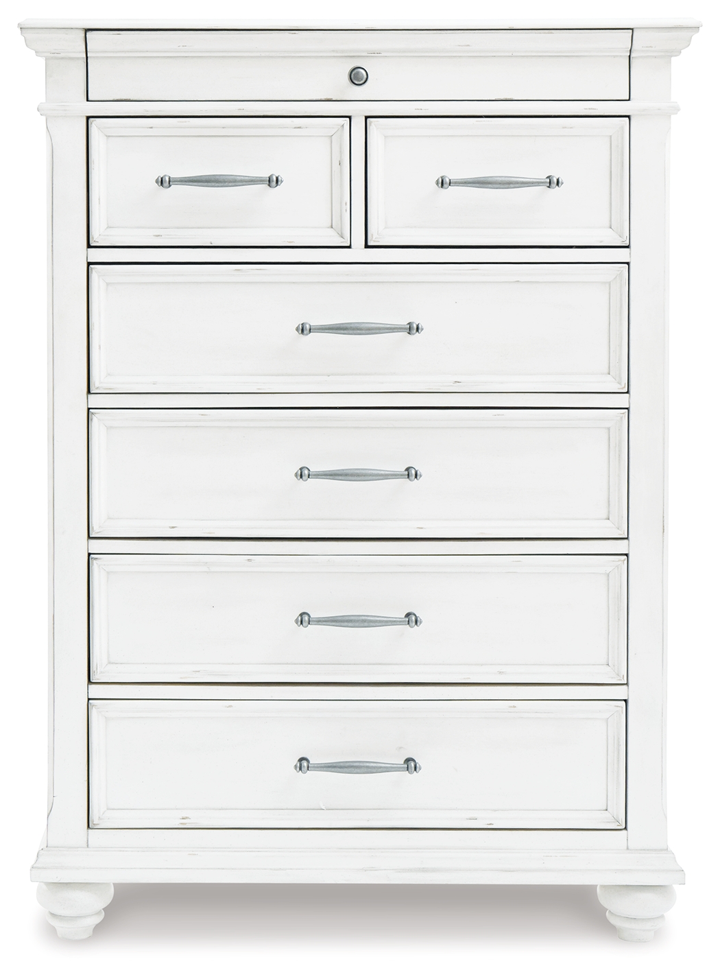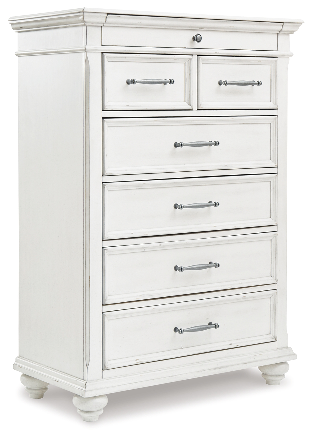 Give your retreat vintage charm with this chest. Sporting a beautifully distressed whitewash finish, it includes seven varied-sized drawers for an organized wardrobe. Generously scaled moulding from top to bottom, along with bun feet and drawer handles with a transitional aesthetic, give this chest character—evoking the feel of a quaint cottage escape. Dimensions: 38”W x 18”D x 52”H Assembly Instructions: https://www.ashleydirect.com/GraphicsVault/Assembly_Instr/B777-31,46,93_AIS.pdf
