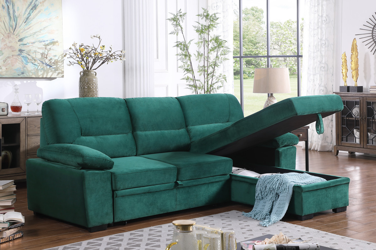 Tags: 17.5" Seat Height, 2" Black Plastic Leg, 21" Seat Back Height, 22" Seat Depth, 24" Arm Height, 76.5" Seat Width, green, Pull-out Sleeper 76.5" x 53", Reversible Storage Chaise, Storage Dimension: 54.5"x21..5"x8"H, velvet