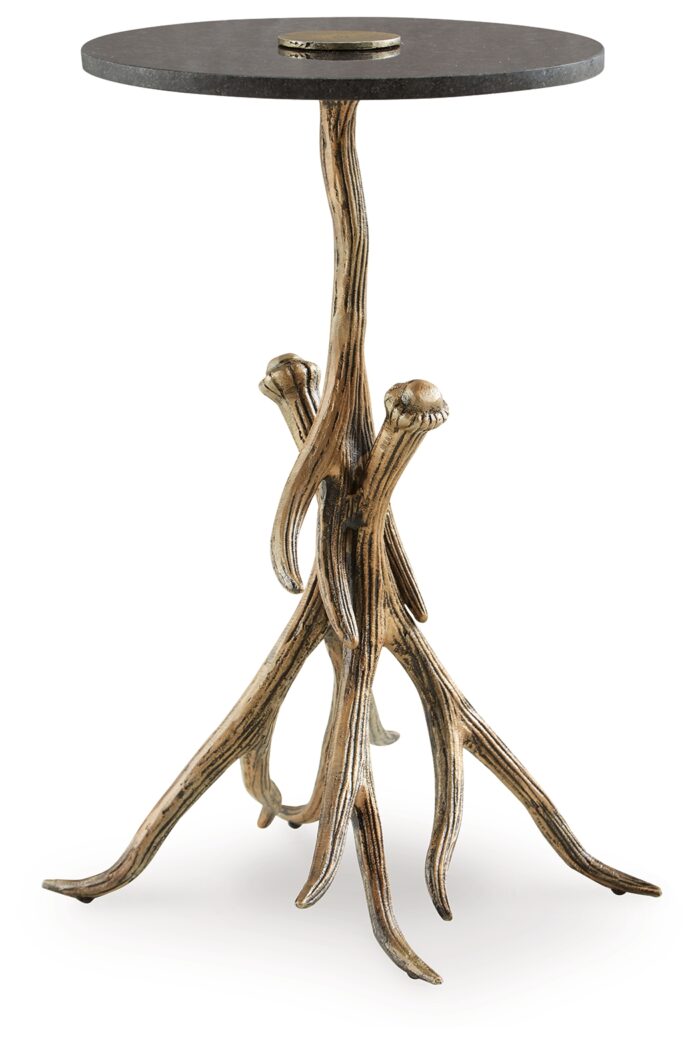 Elevate your living space with the captivating presence of this accent table. Rustic meets contemporary in the nature-inspired statement piece, which effortlessly delivers unique character. Faux antlers and a black marble top add a touch of elegance and character that’s sure to make a lasting impression. Dimensions: 17”W x 16”D x 23”H Assembly Instructions: https://www.ashleydirect.com/GraphicsVault/Assembly_Instr/A4000606_AIS.pdf