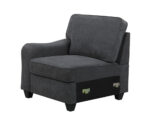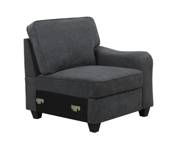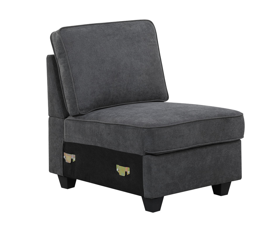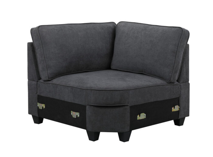 Tags: 1 Corner Chair, 17.75" Seat Height, 18" Seat Back Height, 23" Arm Height, 23" Seat Depth, 3.25" Leg Height, 4 armless chairs, 6 Accent Pillows Included, and 1 Ottoman, dark gray, Includes 2 single-arm chair, Ottoman Measures 34" x 26.5" x 17.75"H, Plastic Legs, Pocket Coil Seating, Rearrange it the way you like with 8 modular pieces; Hook each of the armless chairs on either left or right side, Woven