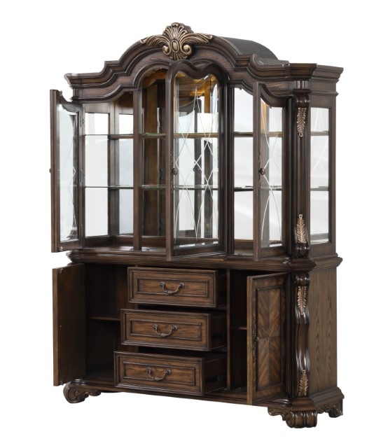Leovanni Traditional Hutch And Buffet in Dark Brown features Ornate Corbels, Ball-Bearing Glides and Fench Front & English Back. Traditional Dark Brown Solid Rubberwood, Oak Veneer, Engineered Wood Ornate Corbels Ball-Bearing Glides Fench Front & English Back Felt-Lined Top Drawers Silverware Tray Gold Tip Crown Molding LED