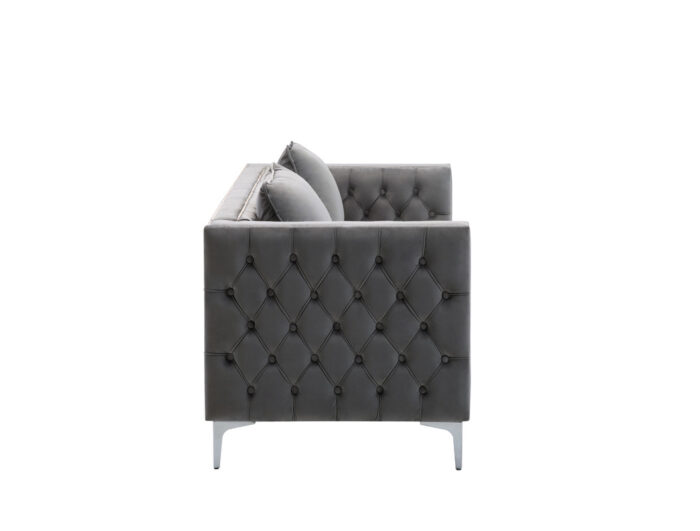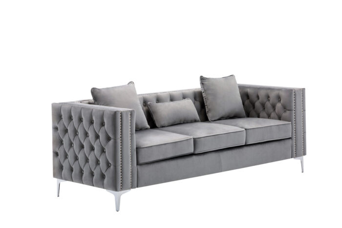 Tags: 18"x18" Pillow Size, 19" Seat Height, 26" Seat Depth, 3 Throw Pillows Included, 69" Seat Width, 7" Seat Cushion Thickness, Chrome Metal Legs, Foam Filled Seats with Pocket Coil Springs, gray, Handmade Button Tufted, Handmade Nailhead Trim, velvet