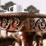 Impress everyone who comes to visit with the fancy and stylish details of this sophisticated dining set! Braided carvings around the table Traditional Brown Cherry Metal, Solid Wood, Wood Veneer, Others Elegant Formal Dining Set Two 18″ Expandable Leaves Pedestal Base Intricate Carved Details Floral Print Fabric Chairs Scrolled Metal Accents