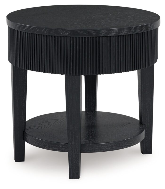 Classic and cool in dark charcoal, this end table brings contemporary convenience to your living room. Short on storage? The trendy reeded apron conceals a drawer perfect for remotes, controllers and other entertainment accessories. What a perfect marriage of style and functionality. Dimensions: 24”W x 24”D x 23”H Assembly Instructions: https://www.ashleydirect.com/GraphicsVault/Assembly_Instr/T551-6_i.pdf