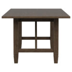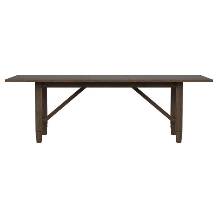 Create a soothing, relaxed ambiance in your welcoming dining room with a transitional five-piece dining set. The set centers on a rectangular table crafted in rubberwoods and graced with a warm, neutral brown finish. Angular support details add trestle-inspired style for a hint of farmhouse flair to the table, which includes an extension leaf for guests. Four side chairs are included, each boasting a matching wooden frame with a plush padded seat in neutral beige upholstery. Rectangular seat backs add rattan, bringing airy appeal and casual character in a kitchen or dining room.
