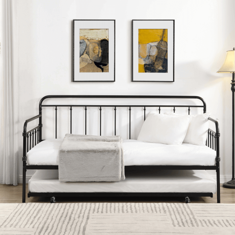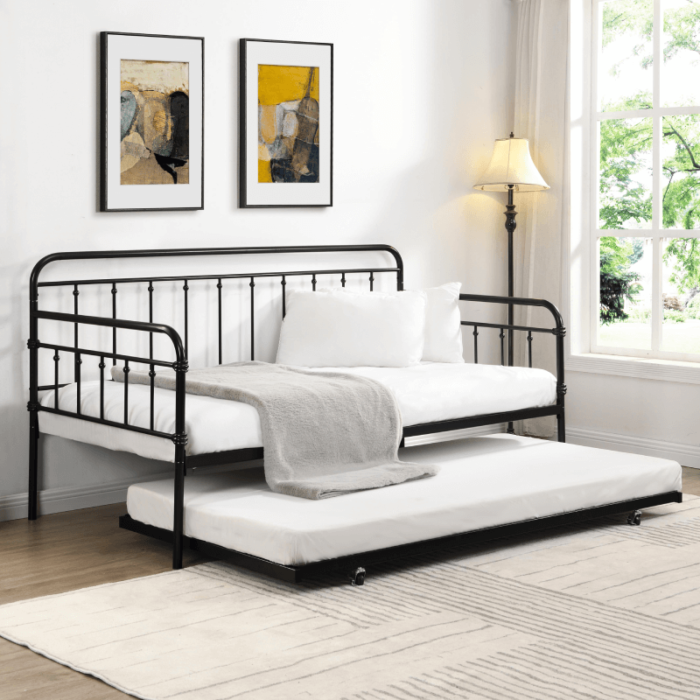 This metal daybed has an industrial look with a clean finish and includes a pull-out trundle.