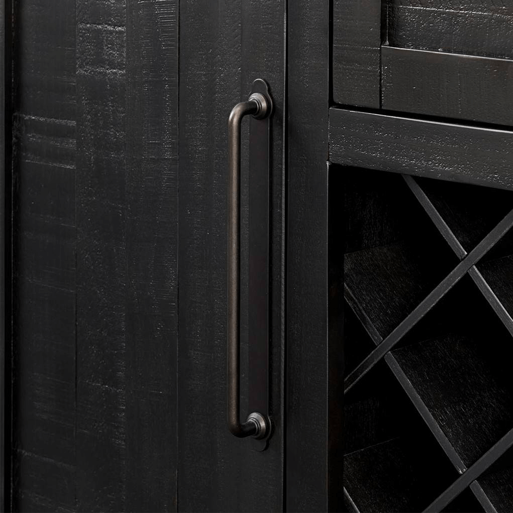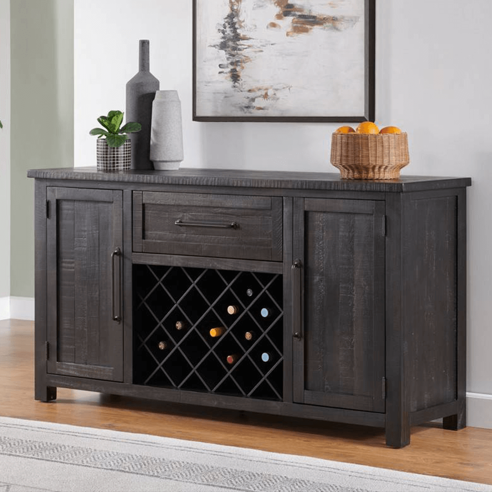 The Napa Dining Server offers casual and farmhouse styling to your dining area. This sideboard offers plenty of storage space with two cabinets with adjustable and removable shelves in multiple configurations. The top drawer and side doors feature a unique oil rubbed bronze bar pull which is reminiscent of cask doors found at a winery. The drawer is lined in felt to protect your finest silverware and other goods. Sixteen bottles of wine can be easily stored in the bottle storage area. Constructed from high-quality solid pine for long lasting use in a beautiful black finish. Server / Buffet / Sideboard dimensions: 65” W x 18” D x 34.25” H. Made in Vietnam.