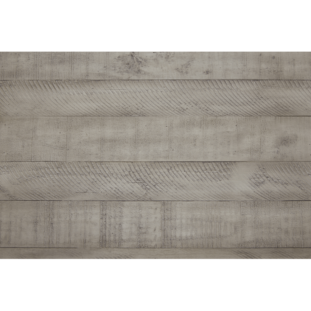 Distressed weathered light gray finish with saw mark texture