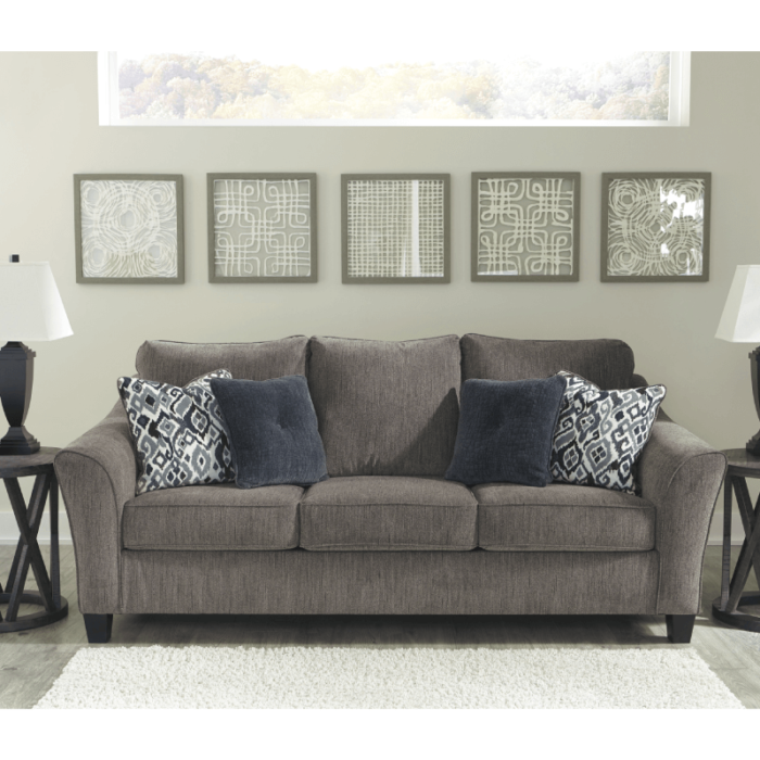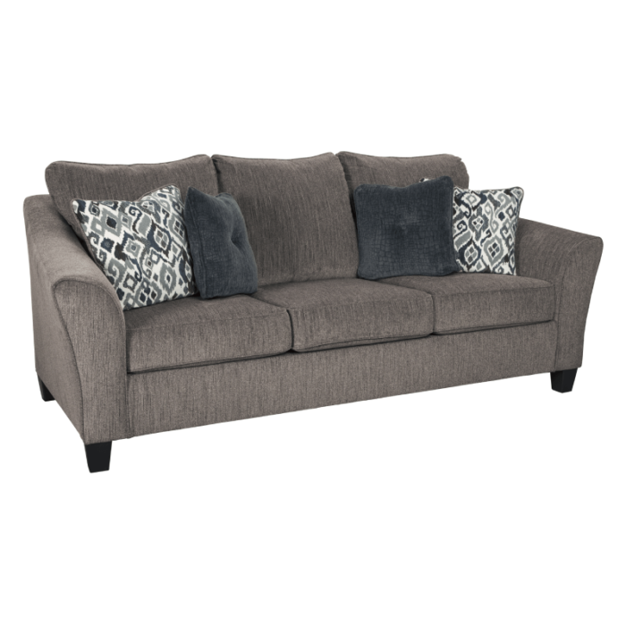 Its textured chenille with solid microfiber upholstery provides a luxuriously soft feel that’s inviting. Gently flared arms and plush seat cushions welcome comfort and relaxation. The on-trend slate-colored upholstery offers a perfect background for the two decorative pillows to pop with beauty.