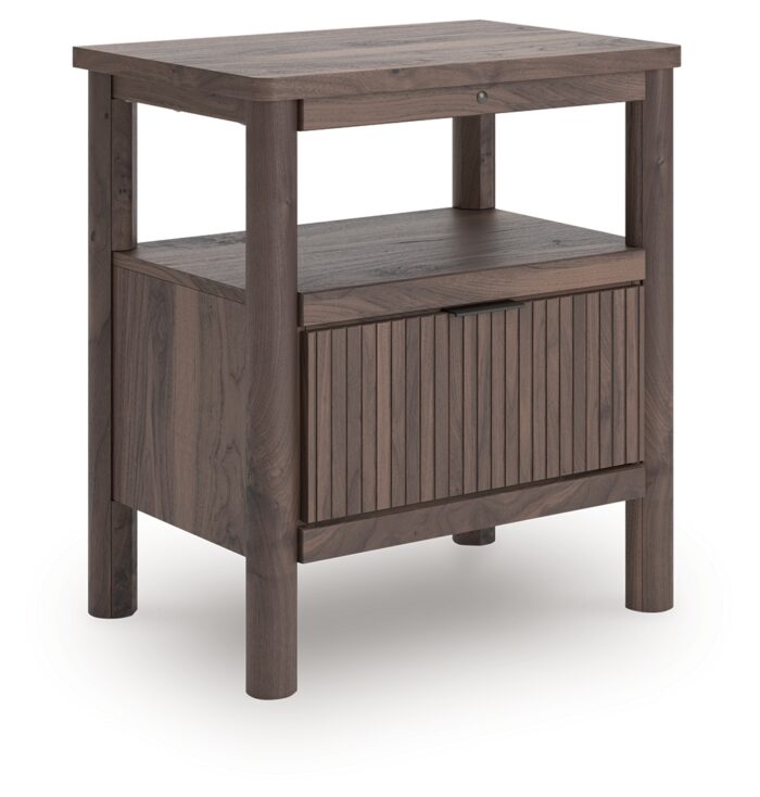 Crafted with both form and function in mind, this nightstand brings a dash of retro-cool character to your modern boho aesthetic. Reeded accents add an on-trend touch to its classic silhouette. Warmly welcoming with a rich brown finish, this piece pairs well with muted hues, earth tones and other neutrals alike. Need a charge? Handy USB ports keep phones, e-readers and tablets charged while you scroll before bed. What a refined take on easygoing style. Dimensions: 25”W x 17”D x 27”H Assembly Instructions: