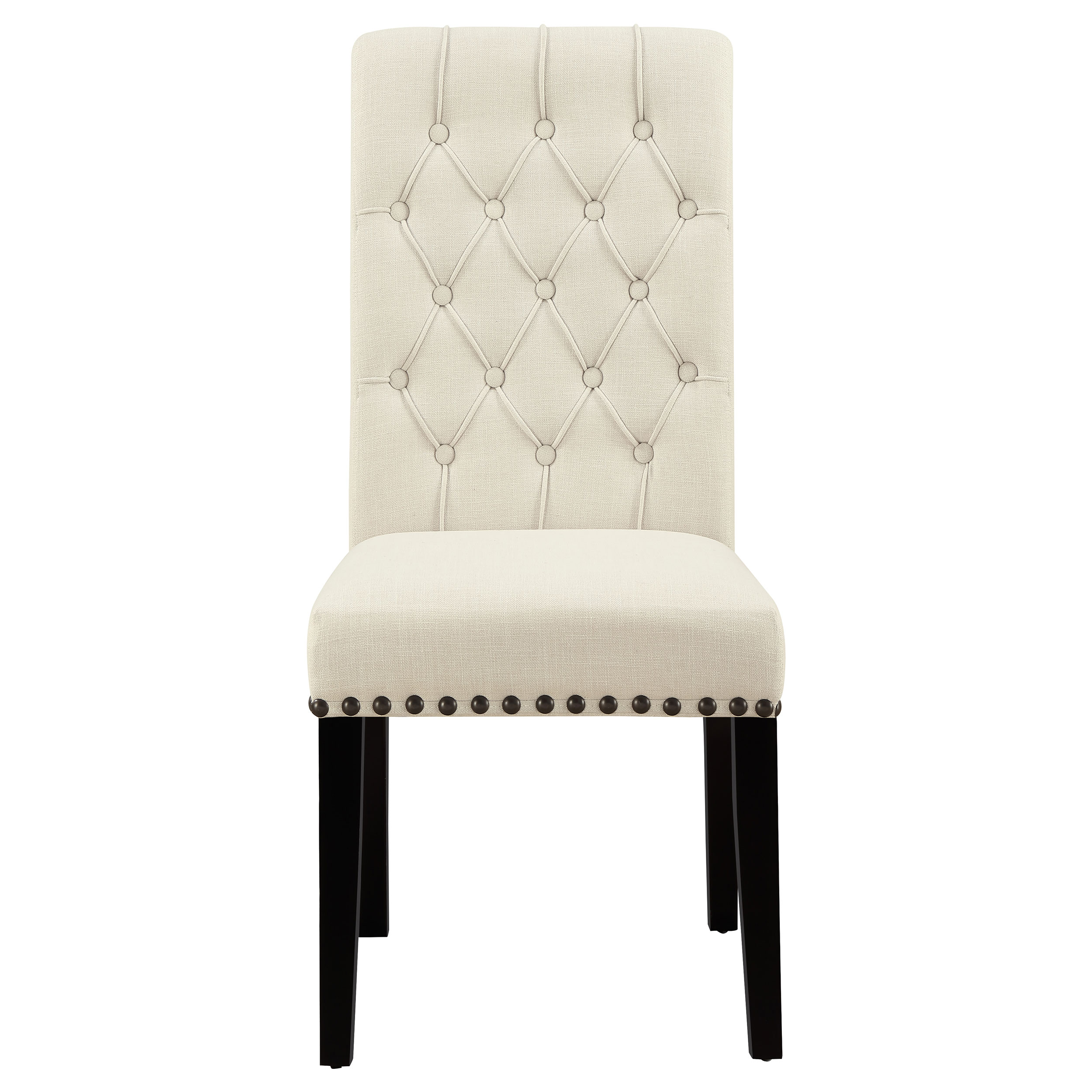 This spectacular 7-piece dining room set is a magnificent addition to the home. Rectangular dining table is meticulously crafted from wood with crisp straight lines. It sits on two broad legs fashioned with curved lines and defined angles with a trestle-like base. The four side chairs have luxurious cushions and rolled seatbacks with button tufting while the two armchairs also have stylish rolled armrests. Chairs are wrapped in stunning white fabric that goes well with contrasting dark nailhead trim and leg finish.