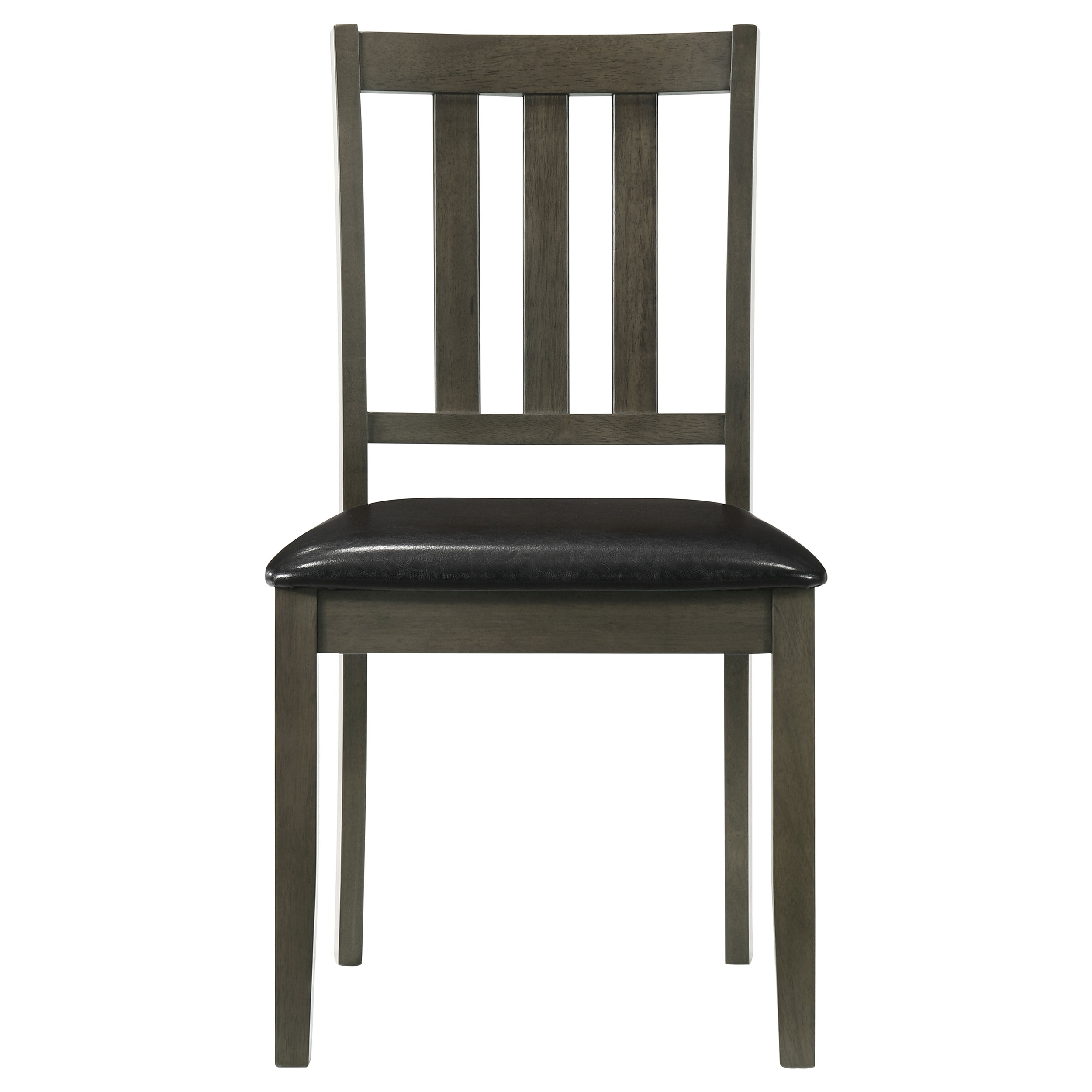 Perfectly sized for a breakfast nook or compact dining room, this contemporary five-piece dining set offers inviting style and a compact profile. The set centers on a square dining table crafted of wood with okume veneer in a stylish, neutral finish. Four chairs complete the set, offering comfort with plush foam padded seats and black faux leather upholstery. Open slatted backs bring an airy touch while maintaining the classic look of this understated set. This set seats four comfortably and looks great with table linens that add a bit of personality.