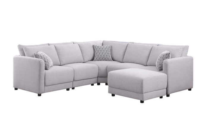 The design of the Penelope sectional resonates with those looking for customization, style, and comfort. The modular aspect of this sectional sofa and the ottoman allows for multiple combinations in order to make design concepts come to life. This makes it easy to furnish any room of choice with a style of your choosing. Plus, the light gray linen fabric with 3 throw pillows will refresh any living room and brighten the day of guests and family. The foam filled seats in addition to the smooth surfaces of the double back cushions are designed to provide a premium relaxation experience for all.