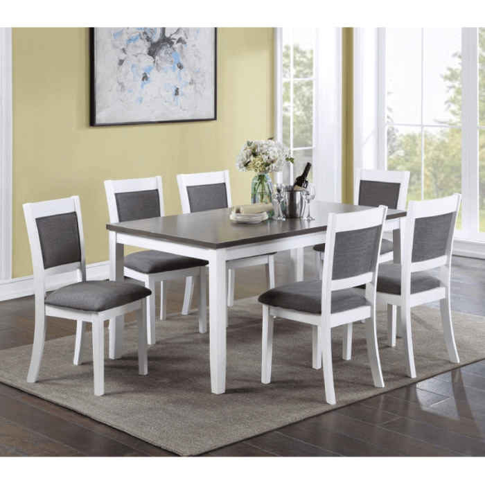 Tags: 7 piece, dining height, grey, In Store Now, two tone, upholstered, White