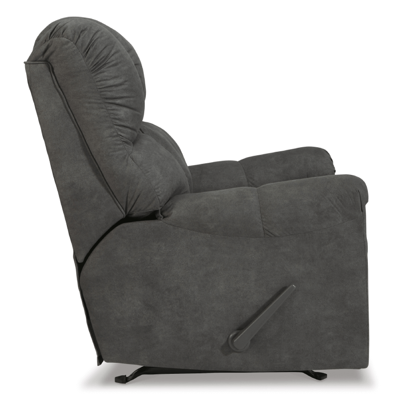 Relax. This rocker recliner indulges you in supreme comfort, conjuring images of a restful retreat that’s all yours. Accessibly neutral faux leather encourages luxurious lounging that won’t break the bank. One-pull reclining assists in ushering hours of simply stylish bliss.
