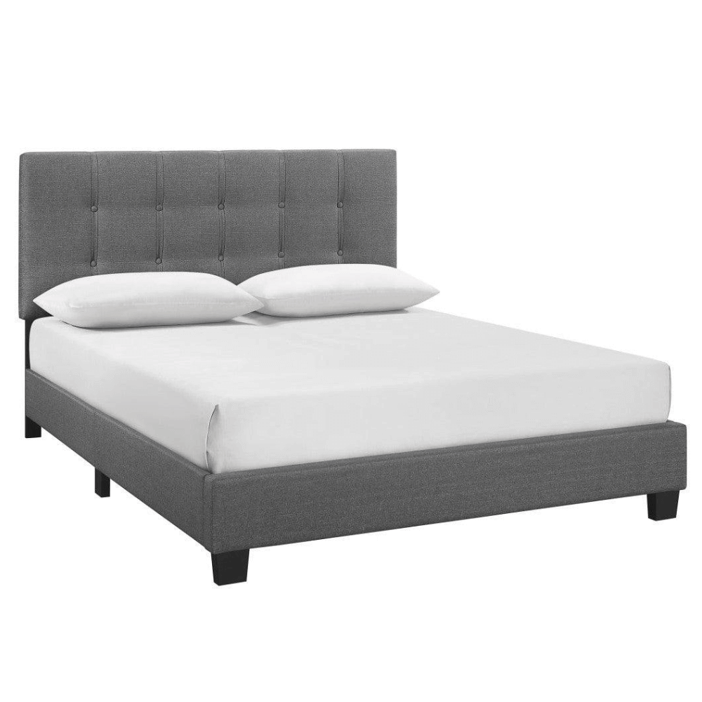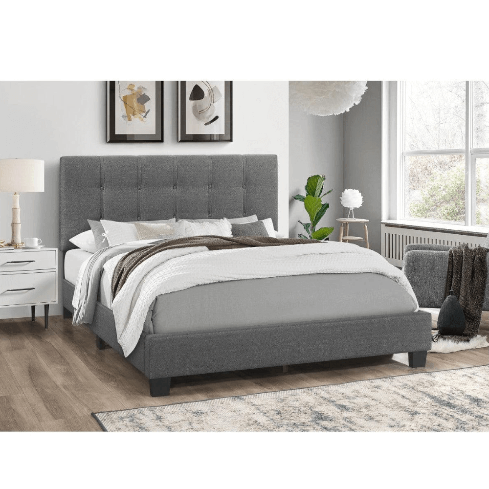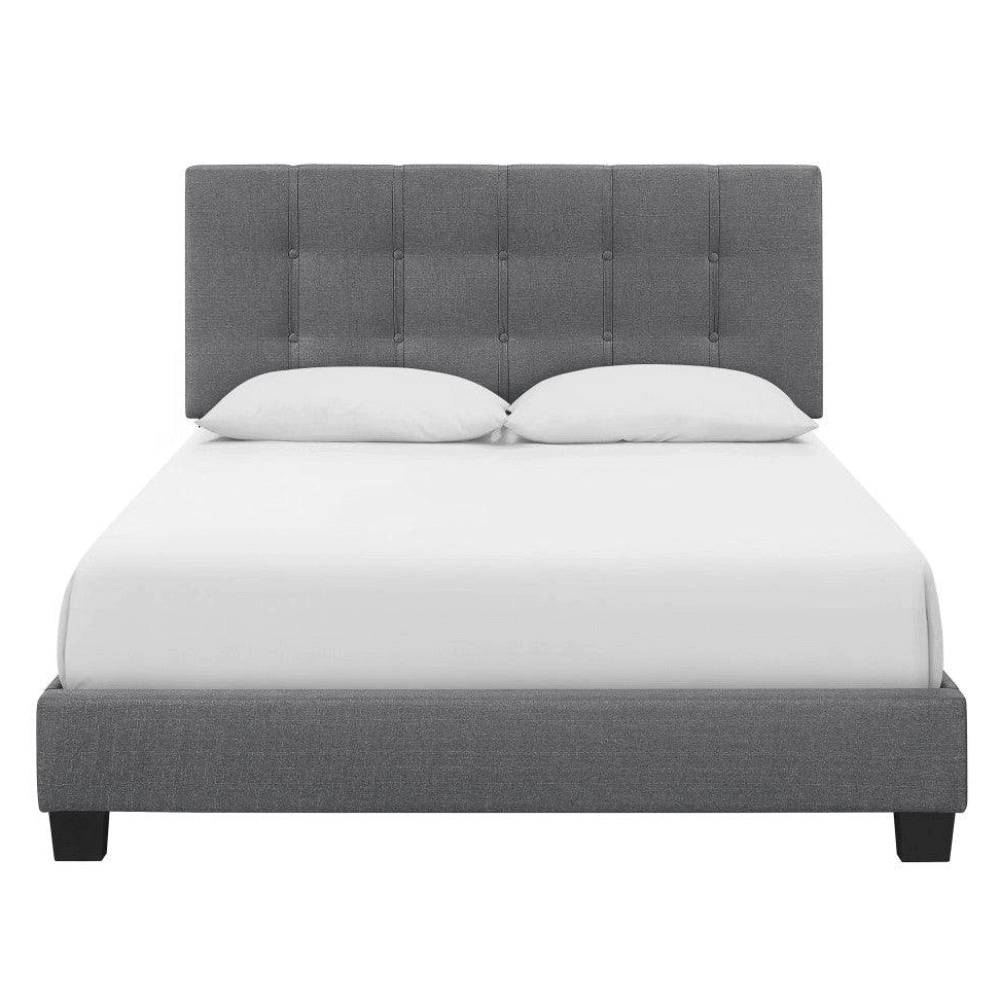 This grey platform bed features a tufted headboard in a grey fabric finish on the headboard, rails, and footboard.