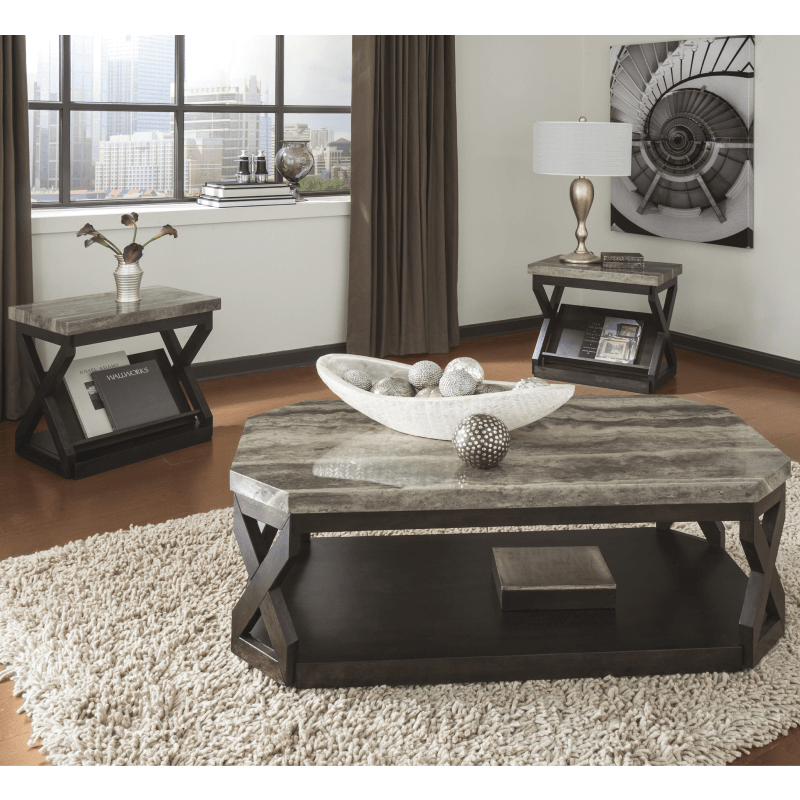 A cool cross of textural elements make the Radilyn coffee table set with crisscross details a striking choice. Bathed in a polyurethane finish for practicality’s sake, the faux marble tops are thick and substantial. Magazine shelves seamlessly blend into the end table design, while optional casters on the coffee table add flexibility.