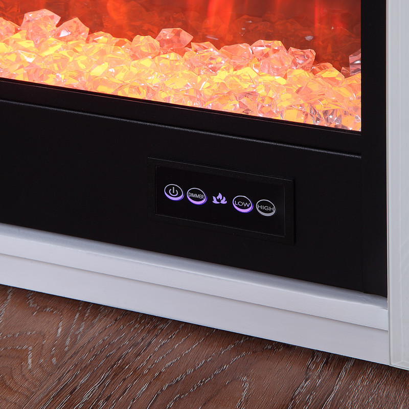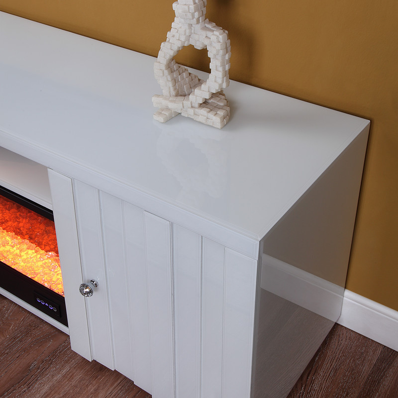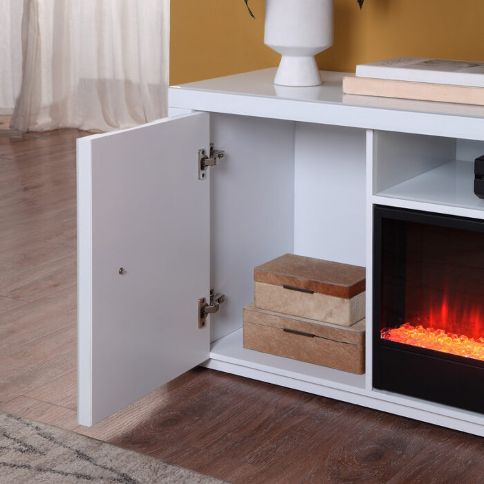Tags: 1 Open Shelf, 2 cabinets, 7 Flame Color Options, Built-in Speaker with Bluetooth Connectivity, Minimal assembly required for the process of adding the stones, Spotlight, White