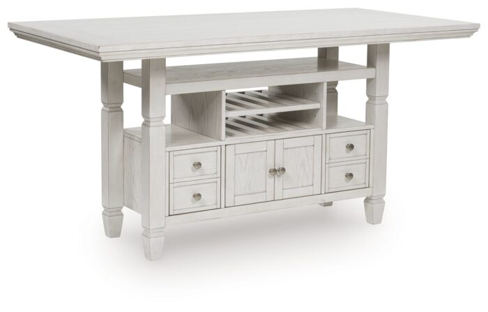 This counter height dining table brings an air of casual charm to mealtime. With its antiqued white finish, farmhouse-style dining has never been so fashionable. And this curated approach to everyday function is loaded with storage options, from cabinets to drawers to wine shelves. All that’s missing is you and your family. Dimensions: 36”W x 72”D x 37”H Assembly Instructions: https://www.ashleydirect.com/GraphicsVault/Assembly_Instr/D642-13B,13T_AIS.pdf