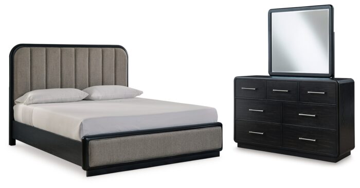 Rowanbeck King Upholstered Panel Bed, Dresser and Mirror – Ashley Direct