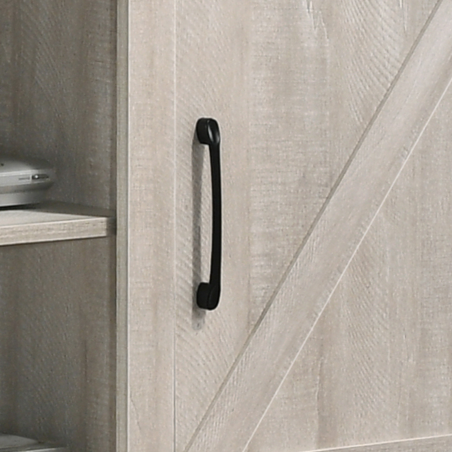 Tags: 2 Barn Style Cabinets, 2 Open Shelves and 2 Shelves in each Cabinet, 20.5" Wide Center Shelves and 16.5" Wide Side Shelves, Anti-tipping bracket included, Black Handles, Black Hinges, Cable Management in the Center Shelves, Can Hold Most 63-inch TVs, Dusty Gray, Particle Board Construction