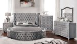 There’s something special about a round bed, and this piece certainly exudes that air of glamour. It is upholstered in velvet-like fabric and tufted all around with acrylic crystals. The stylish wingback headboard with n Glam Gray Velvet-Like Fabric, Others Padded Flannelette Fabric Wingback Design Button Tufted Headboard Crystal-Like Acrylic Buttons Mattress Ready USB Port on each side of Headboard Storage Compartments in Bed Rail and Footboard