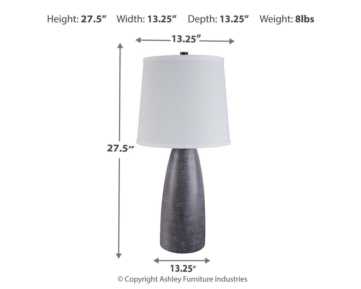 Modern style shape-up. You love all things contemporary, but bling isn’t your thing. Behold the beauty of this table lamp. Smooth, subtle lines speak volumes. Hint of radiance on the base brings just enough sheen to the scene. Dimensions: 13”W x 13”D x 28”H Assembly Instructions: https://www.ashleydirect.com/GraphicsVault/Assembly_Instr/L243004_i.pdf