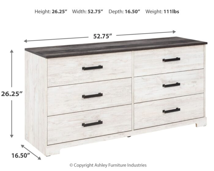Give provincial a new meaning with the chic look of this dresser. The two-tone finish keeps this piece light and fresh while the warm pewter-tone hardware adds an industrial touch. The distressed whitewashed body adds a delightfully homespun charm to your space. Dimensions: 53”W x 17”D x 27”H Assembly Instructions: https://www.ashleydirect.com/GraphicsVault/Assembly_Instr/10023167.PDF