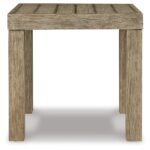 Beautifully on point, this outdoor end table is the natural choice for modern minimalists who know that less is more. Quality crafted of eucalyptus wood, this ultra clean-lined outdoor table is enriched with a multi-step embossed finish that both brings out the wood’s natural grain and protects it from the elements for seasons of fun in the sun. Incorporating form and function, the plank top naturally sheds rainwater. Dimensions: 22”W x 22”D x 20”H Assembly Instructions: https://www.ashleydirect.com/GraphicsVault/Assembly_Instr/P804-702_AIS.pdf