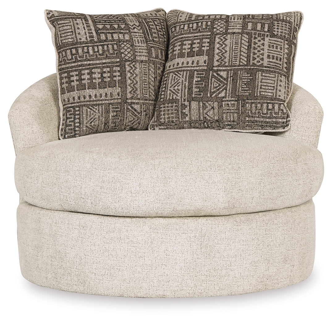 Flaunting a trendsetting silhouette, this swivel accent chair puts the contemporary in your contemporary home. Its 360-degree swivel gives you an around-the-room view to complement your comfort. And the chunky chenille fabric satisfies your need for a piece that feels as good as it looks. Soft jacquard chenille throw pillows add a splash of geometric pattern and color contrast. Dimensions: 45”W x 44”D x 37”H Assembly Instructions: