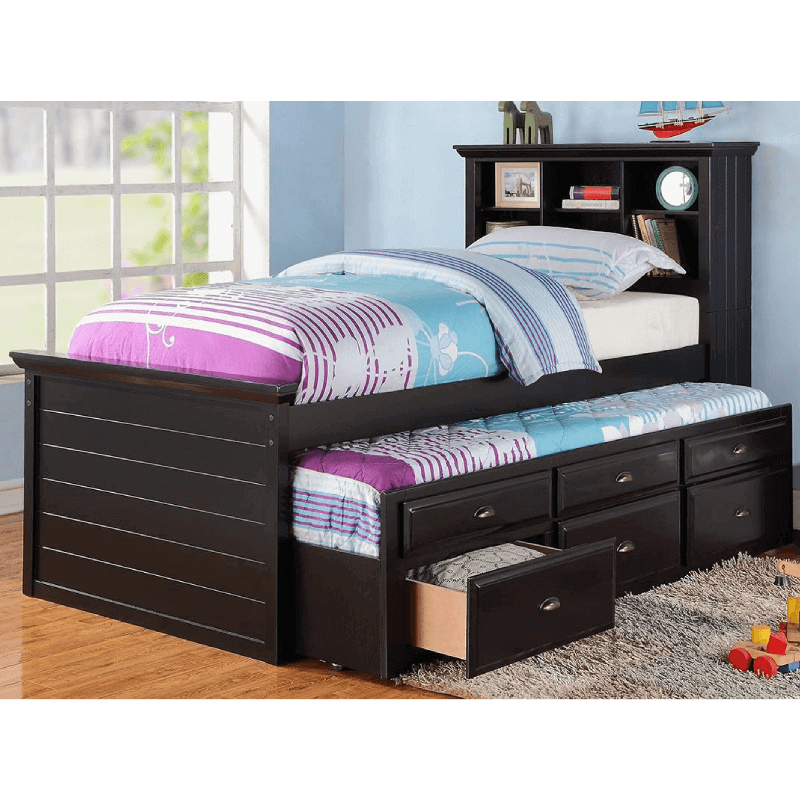 This black finish trundle bed comes with 3 drawers, a twin trundle, and is made from pinewood and also features a bookshelf on the headboard.