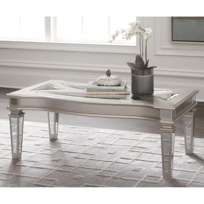 Tags: beveled glass, cocktail table, coffee table, glass, In Store Now, mirrored, silver