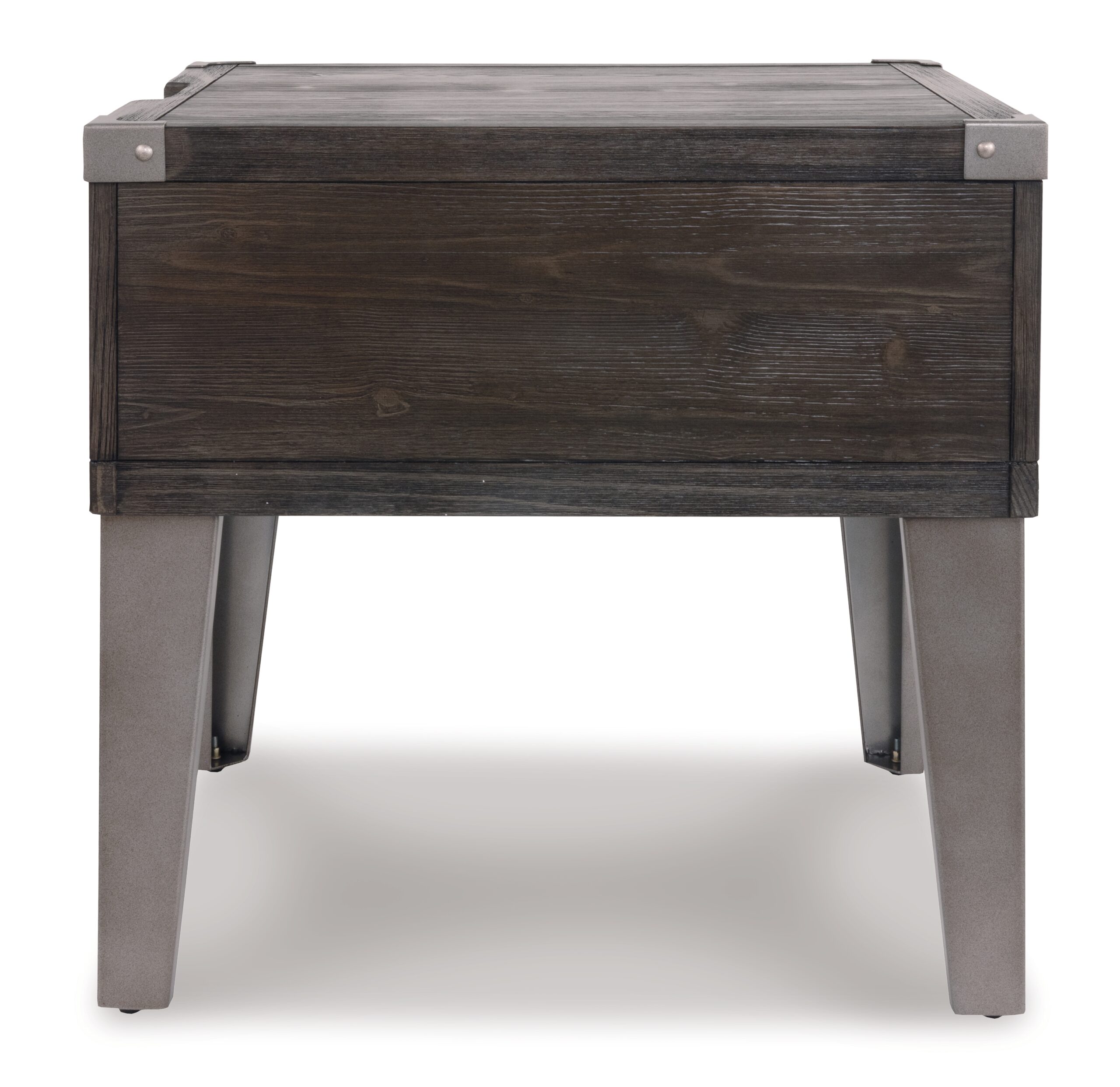 Take a stance for rustic-industrial style with this mixed material end table. Weather-washed pine wood and veneers are contrasted with canted metal legs and corner bracket accents for a uniquely chic merger of earthy beauty and contemporary flair. Power plug-ins and USB charging ports mounted on the back add practical function to great form. Dimensions: 23”W x 25”D x 24”H Assembly Instructions: https://www.ashleydirect.com/GraphicsVault/Assembly_Instr/T901-3_AIS.pdf