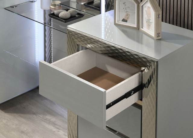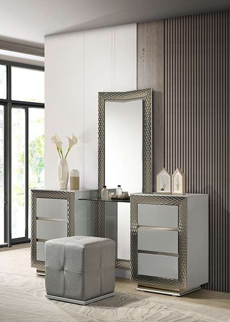 Ventnor Glam Vanity Set in Gray features Chevron Headboard, LED on Headboard and Mirror and Metal Side Glide. Glam Gray Satin Fabric, Solid Wood, Rubberwood, Engineered Wood Chevron Headboard LED on Headboard and Mirror Metal Side Glide Felt-Lined Top Drawer Plinth Base w/ Silver Molding Mattress Ready Glass Shelf