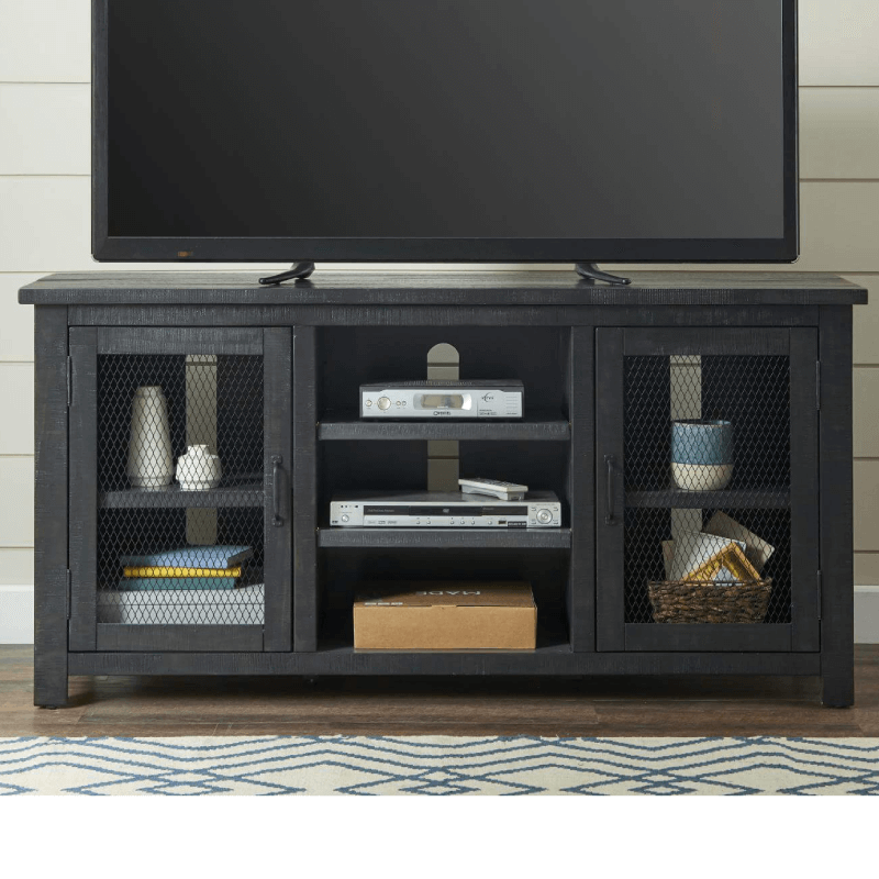 This 60″ TV Stand has booth Rustic and Farmhouse styles while being a functional TV stand. It also has 2 side cabinets with a farmhouse style mesh door insert and 4 adjustable shelves in grey Finish.