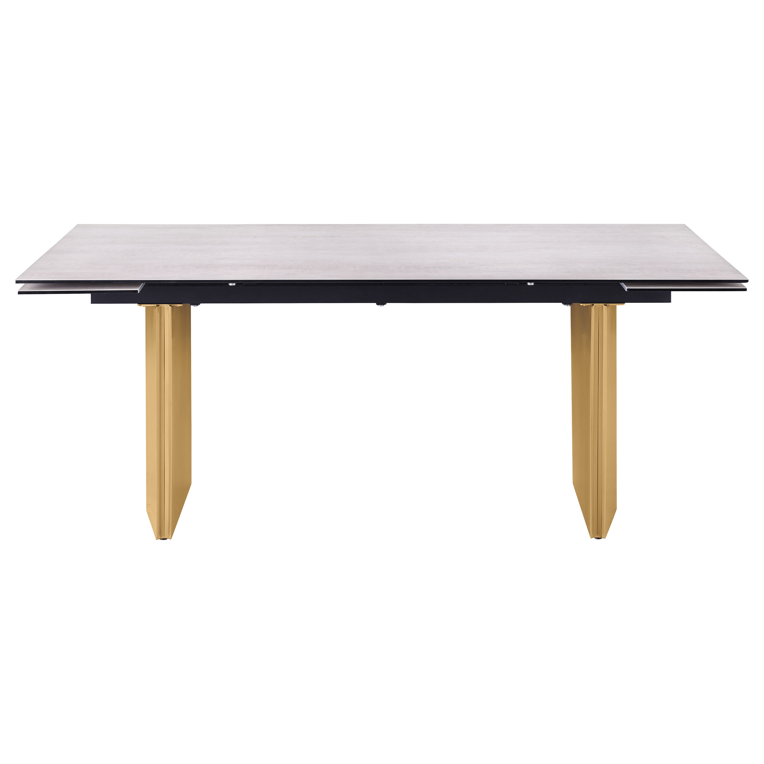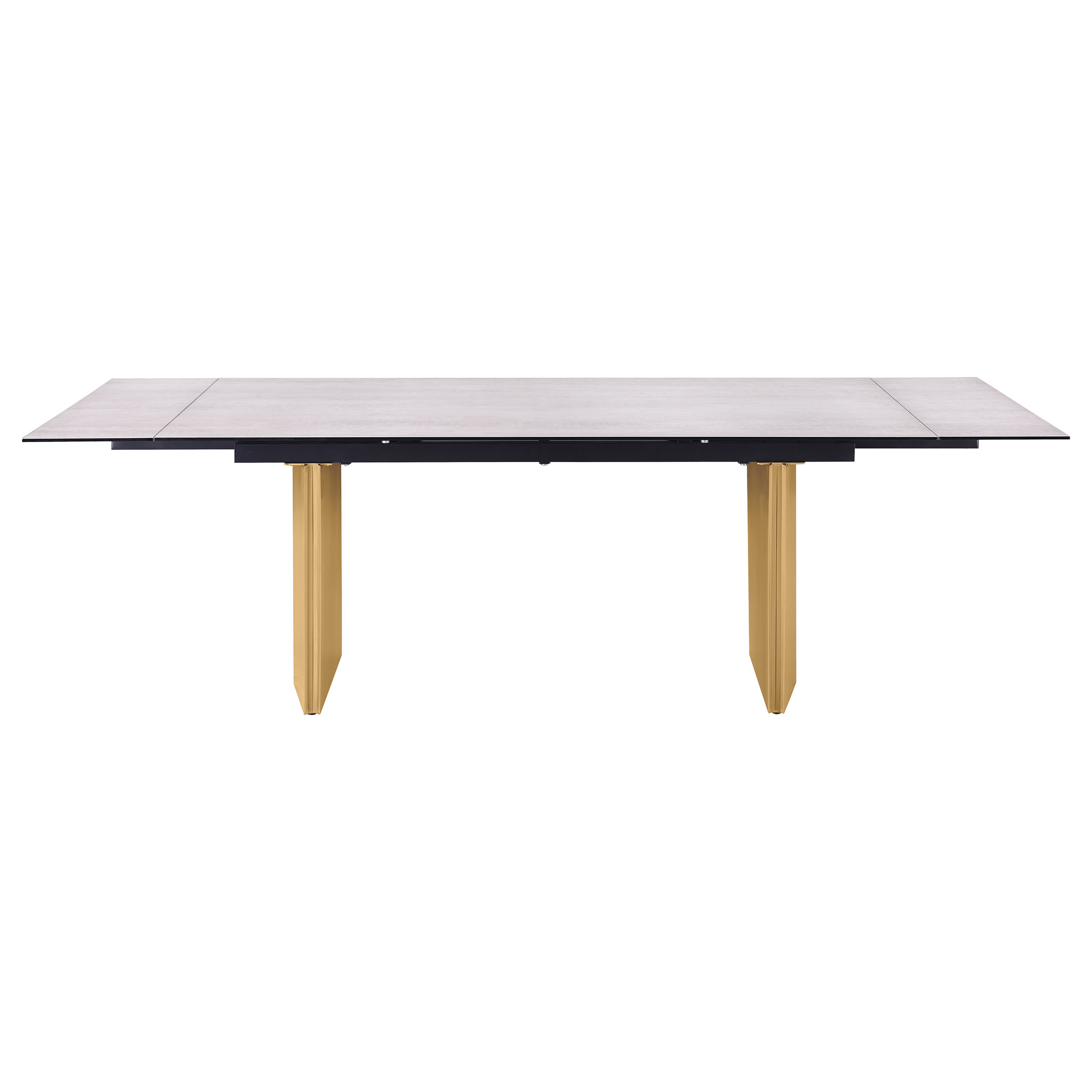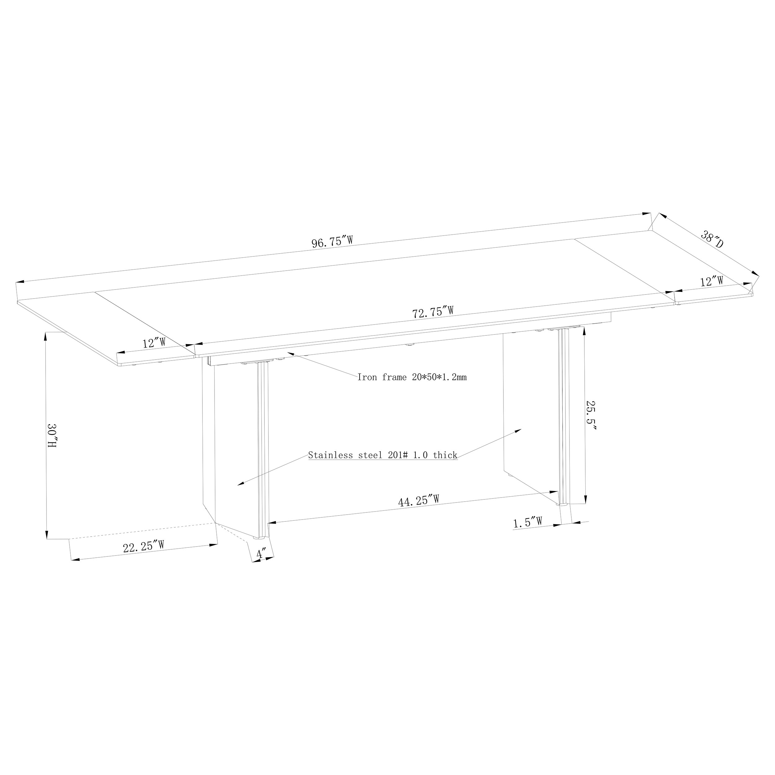 This modern dining table showcases a stunning beige glass top with a 3D-printed design, supported by a brushed gold stainless steel base for a sophisticated and luxurious look. Perfect for hosting, the table features two 12-inch refractory extension leaves on each end, seamlessly expanding the seating capacity for larger gatherings. The combination of sleek materials, elegant finishes, and clean lines makes this table a statement piece for contemporary dining spaces, blending beauty and functionality.