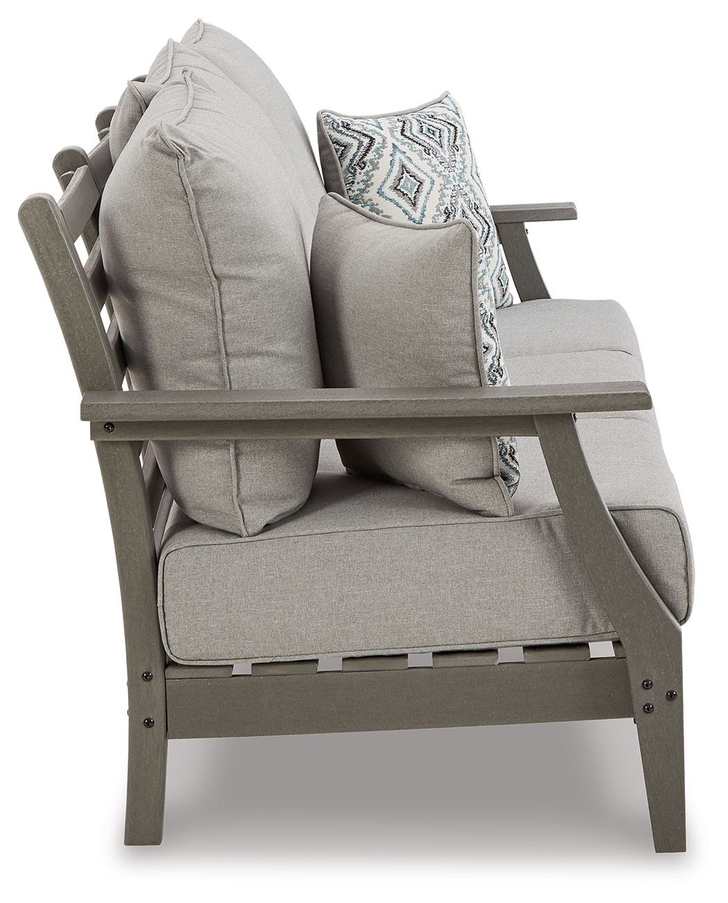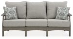 It’s the dawn of a new day for gray. Embrace the style trend with this outdoor sofa. Crafted of HDPE material that combines the exceptional durability and weather resistance you need with the “wood look” you love, this comfortably cushioned sofa takes outdoor living to a whole new level. Rest assured, the thick seat and back cushions and throw pillows are wrapped in our exclusive Nuvella® high-performance fabric that’s fade resistant, stain resistant and a breeze to clean. Dimensions: 80”W x 33”D x 37”H Assembly Instructions: https://www.ashleydirect.com/GraphicsVault/Assembly_Instr/P802-838_AIS.pdf