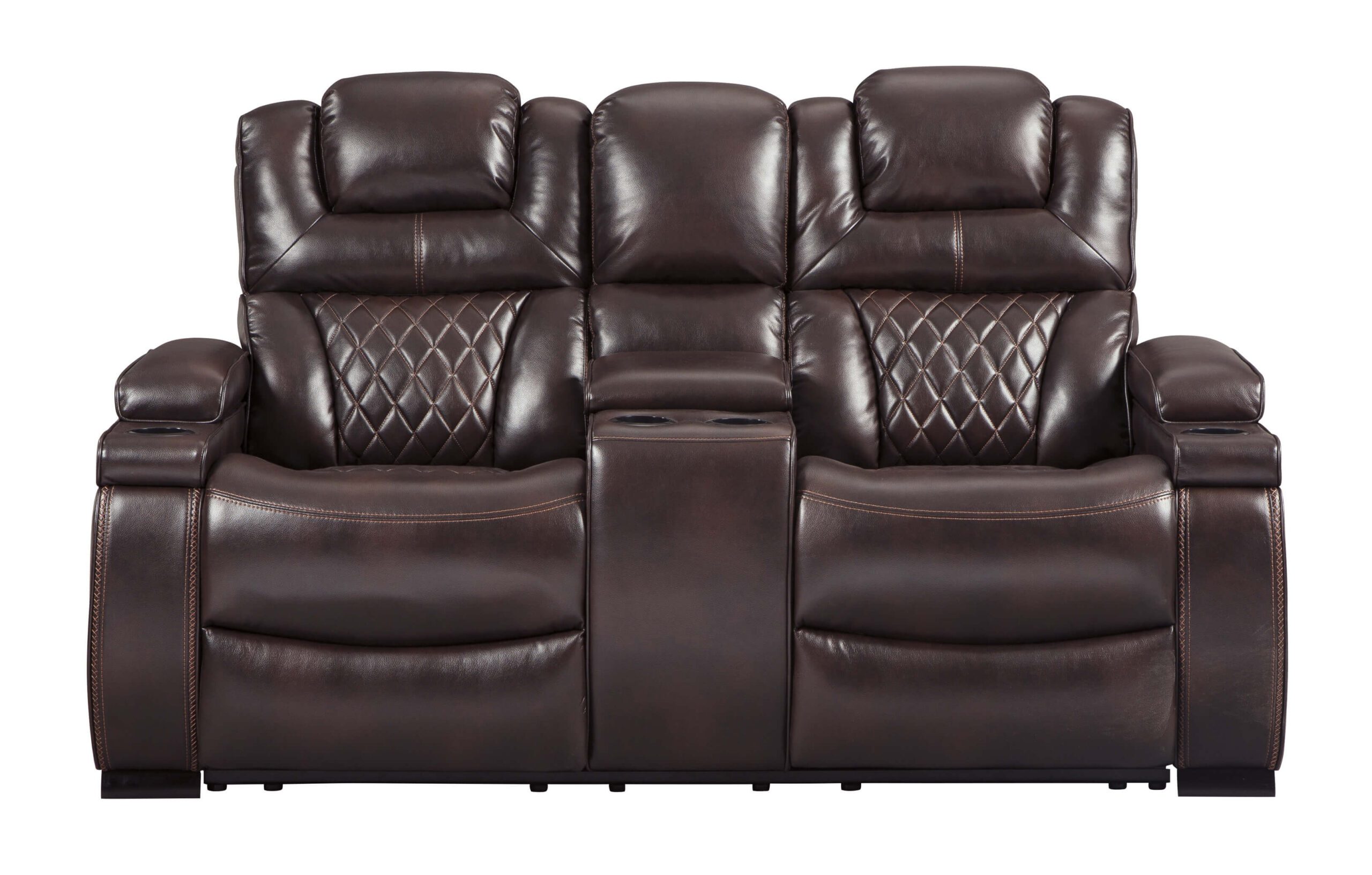 Your modern living room awaits with the Warnerton power reclining sofa. Complete with practical faux leather upholstery, one-touch power controls, adjustable headrests and USB ports, it makes finding the best seat in the house a breeze. What a perk that the center seat is crafted with a drop-down table with power/USB plug-ins and dual cup holders. Armrests with storage and cup holders keep drinks, snacks and remotes close by. Go ahead—treat yourself to a high-design home theater experience, priced to put you at ease.